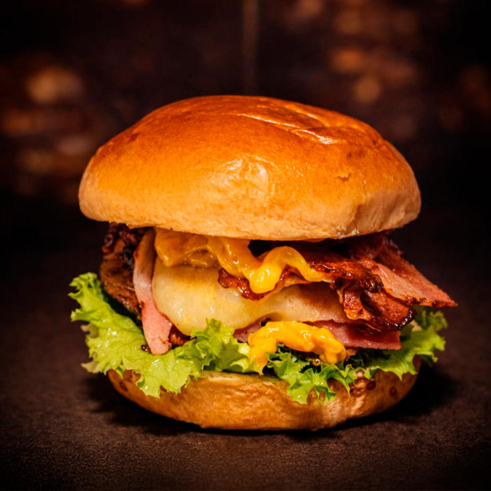 Pão brioche premium selado na manteiga, burger artesanal suculento, presunto levemente grelhado, muçarela derretida, creme cheddar cremoso, cebola roxa crocante, tomate fresco e alface americana. Finalizado com molho especial da casa.