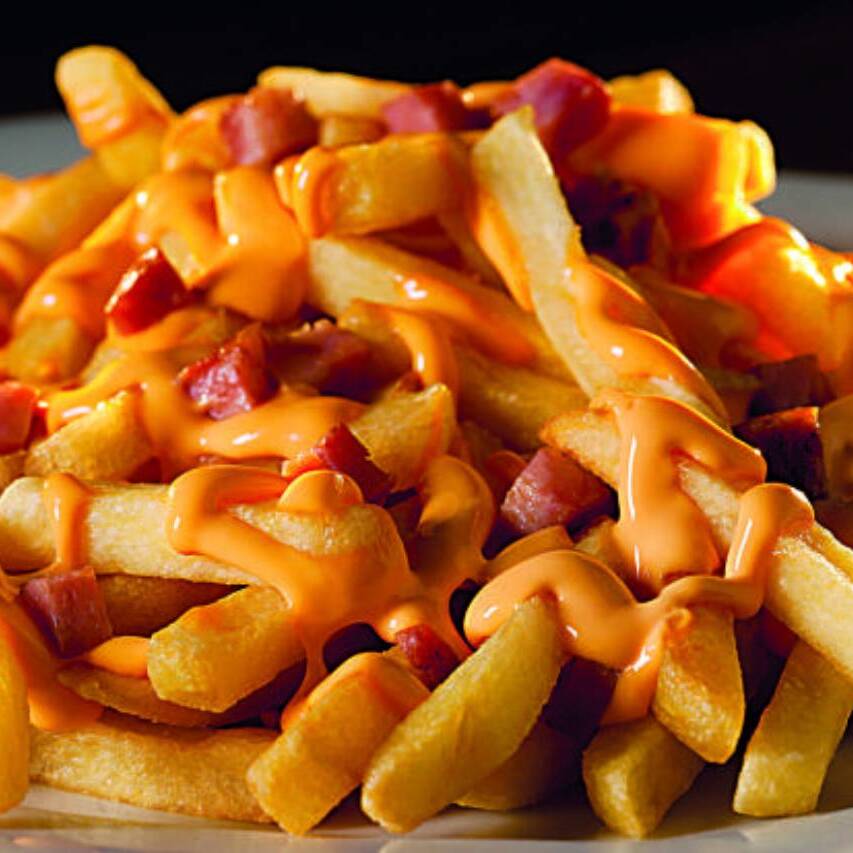 Com batatas crocantes e douradas, cuidadosamente escolhidas e pesadas antes de serem fritas . O recheio de molho cheddar cremoso e suculento é um deleite para o paladar. Para finalizar, uma pitada generosa de bacon picadinho por cima, adicionando uma explosão de sabor e textura. É, sem dúvida, uma delícia imperdível!