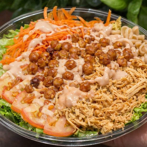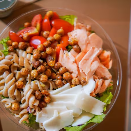Mix de folhas (alface crespa, rúcula e repolho roxo), lascas de salmão assado (ou falafel), macarrão integral, tomate cereja, mussarela de búfala, crispy de grão de bico e molho pesto. Serve 1 pessoa