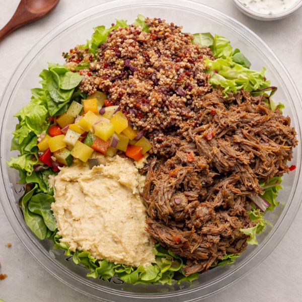 Carne Desfiada Suculenta Com Mix de Folhas Orgânicas, Hommus Cremoso, Tabule Fresco, Caponata, Croutons Crocantes e Molho de Iogurte com Pepino e Hortelã. Serve 1 Pessoa. Peça Agora 🥗🔥