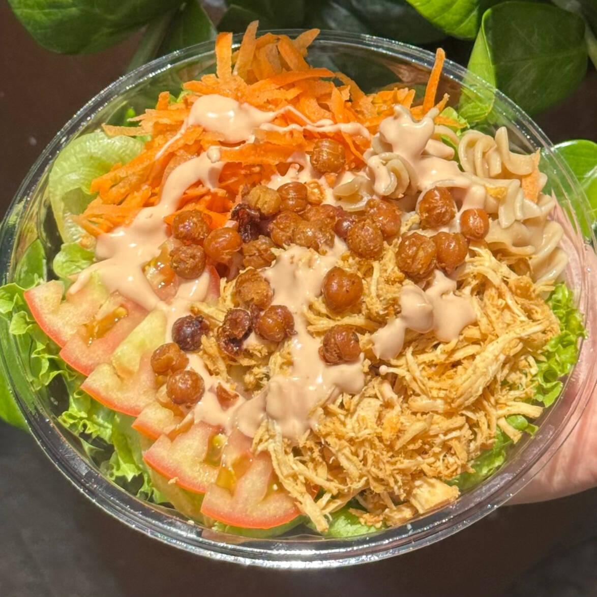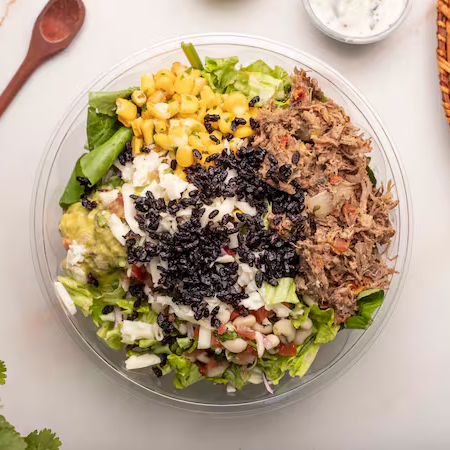 Mix de Folhas orgânicas (alface crespa, rúcula e repolho roxo), Carne Desfiada (ou Faláfel), Vinagrete de Feijão Fradinho, Milho Refogado, Guacamole, Queijo Coalho e Pipoca de Arroz Negro e Molho de Pimentão Vermelho (agridoce e levemente picante).