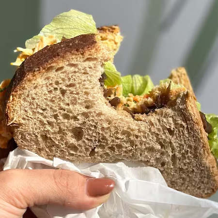 Nosso sanduba natural, genuinamente saudável e incrivelmente gostoso! Pão integral, alface americana, patê de frango desfiado, cenoura ralada, cebolinha e maionese light com toque de limão. Serve 1 pessoa