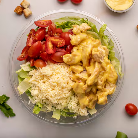 A Caesar da Casa | Alface Americana orgânica, Iscas de Frango (ou Faláfel), Tomate Cereja, Queijo Parmesão, Croutons e Molho Caesar.