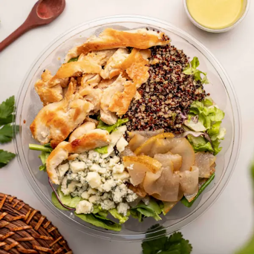 Mix de Folhas orgânicas (alface crespa, rúcula e repolho roxo), Iscas de Frango (ou Faláfel), Mix de Quinoa, Pera Caramelizada, Queijo Gorgonzola, Croutons e Molho de Mostarda e Mel. Serve 1 pessoa