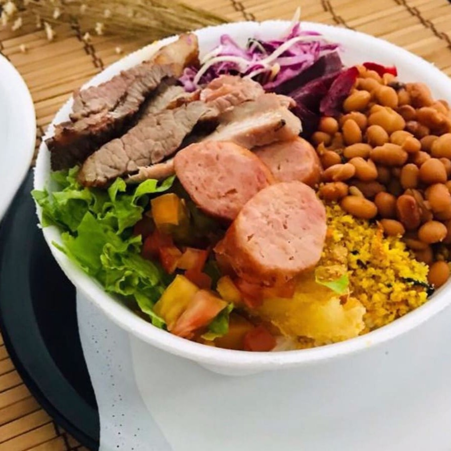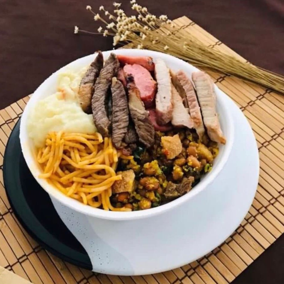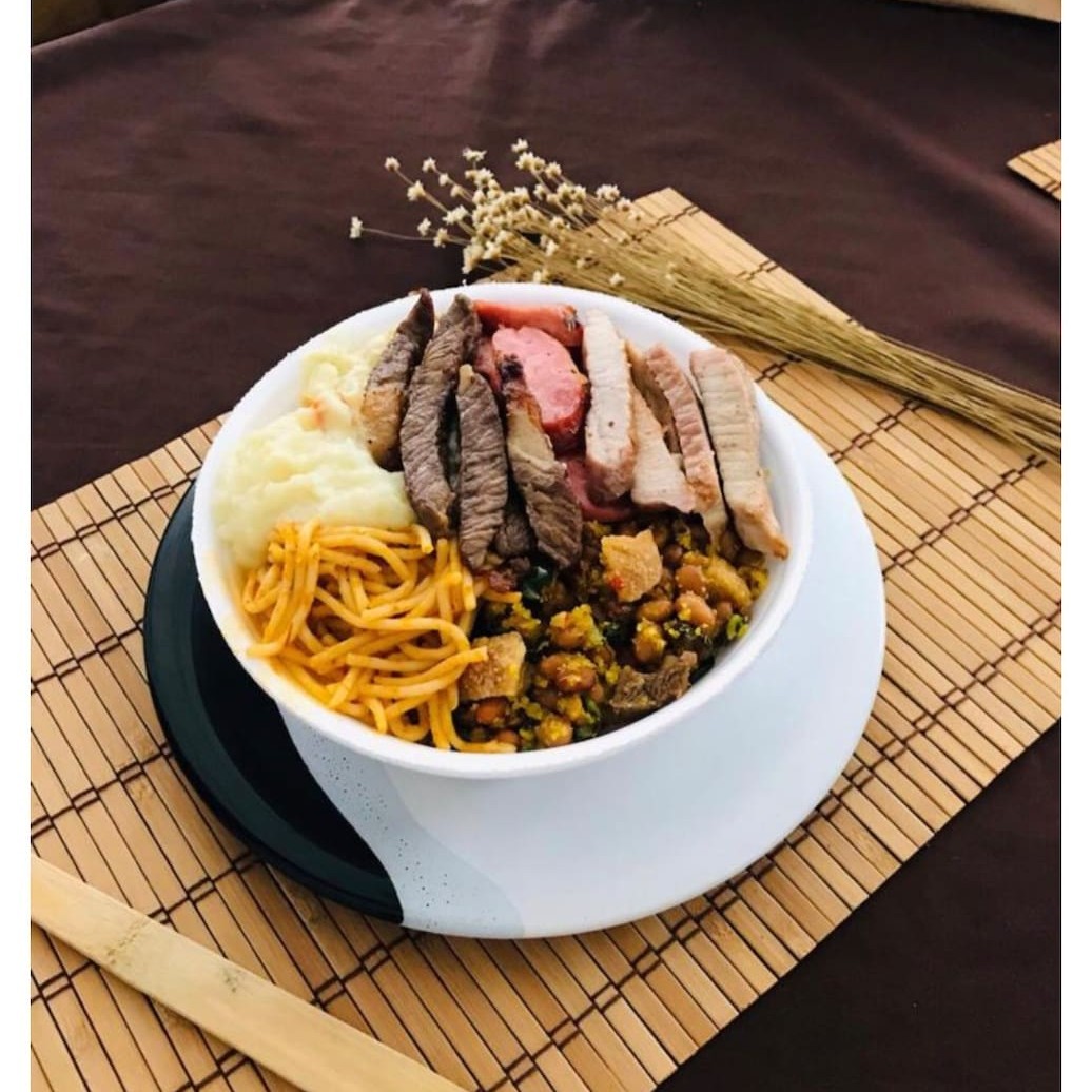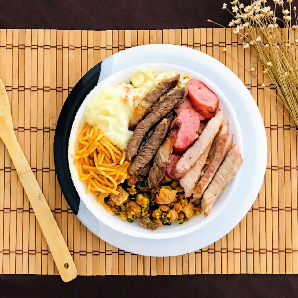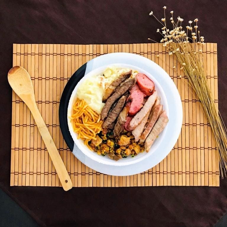 Arroz Branco, Feijão Tropeiro, Macarrão, Salada tropical, Salada de repolho, Verdura do Dia, Mix de churrasco (Churrasco de carnes variadas)