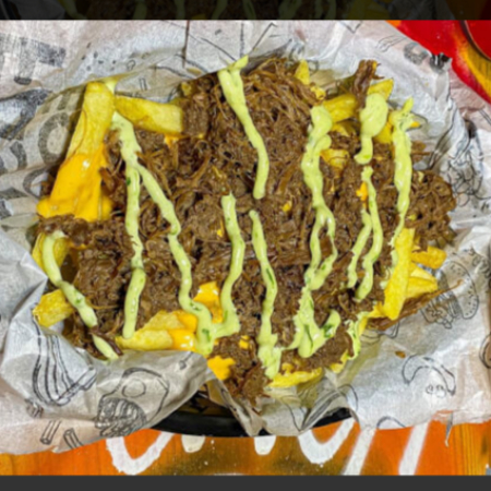 Batata palito com chedda e 100g de costela desfiada feita na casa