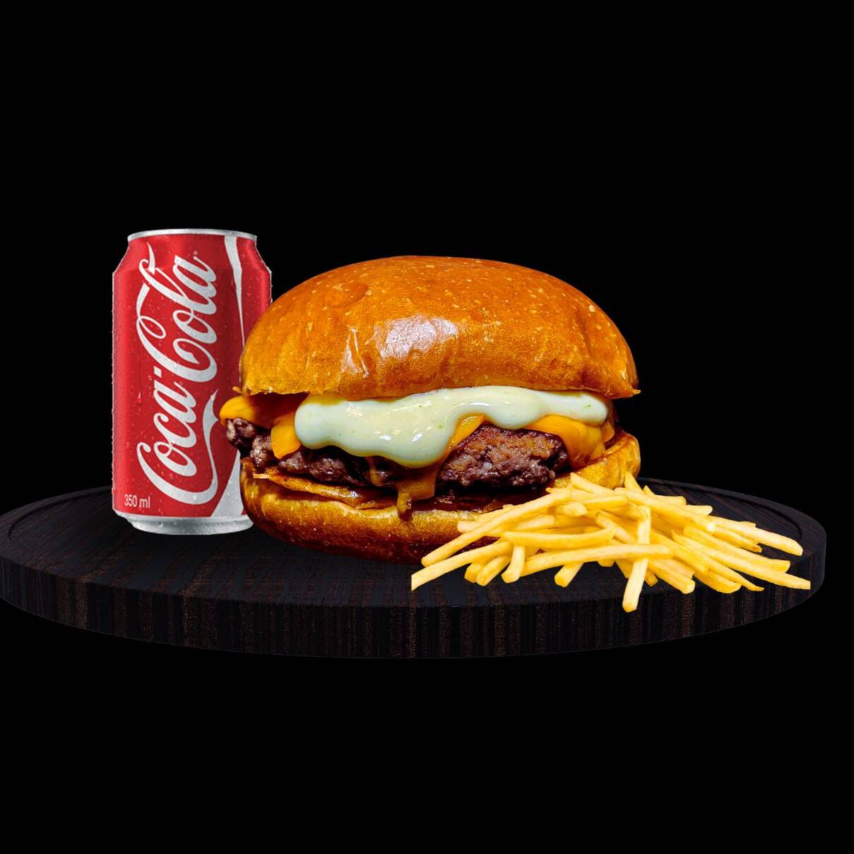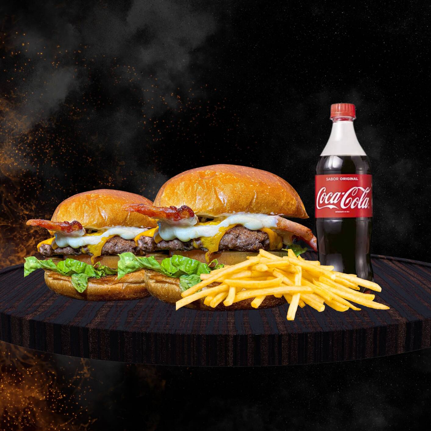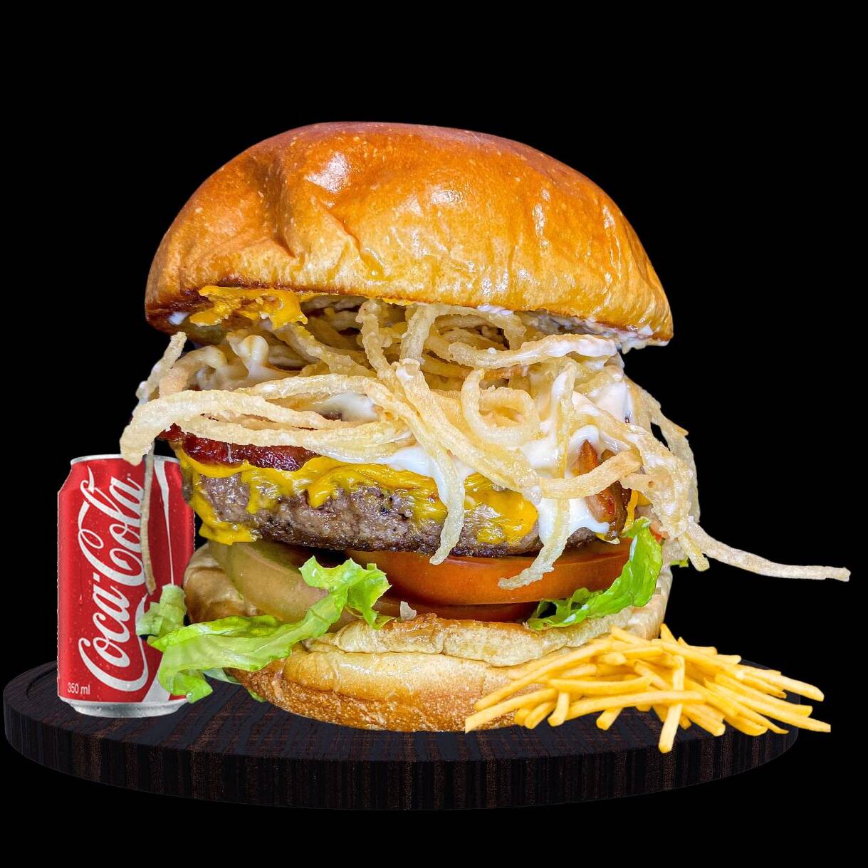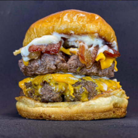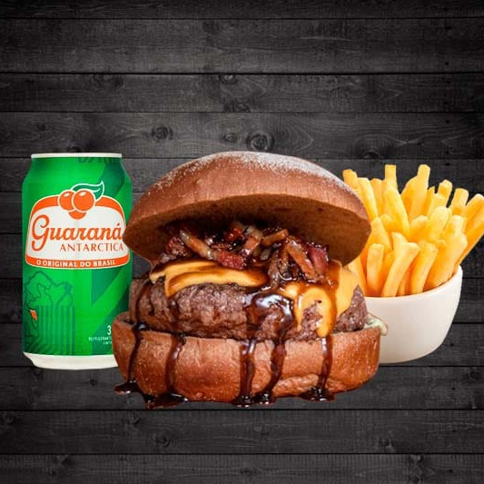 2 Hamburgueres de 150g cada, queijo chedda, bacom, molho da casa e pão brioche