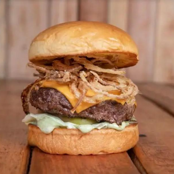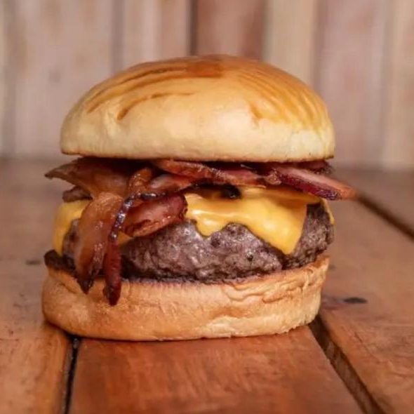 Hamburguer de 150g, queijo chedda, bacon, cebola crispy feita na casa, molho e pão brioche