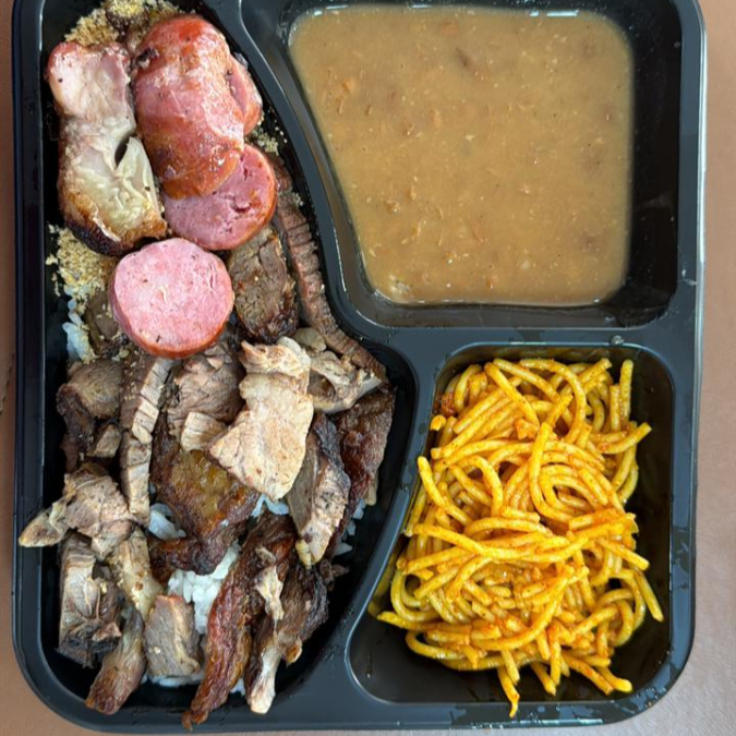 + 4 Acompanhamentos : Feijão Tropeiro, Arroz, salada do dia(embalagem separada), Legumes do Dia, Farofa + Refrigerante Lata(foto ilustrativa)