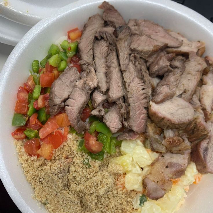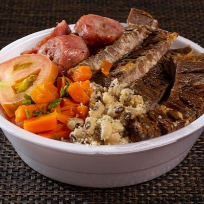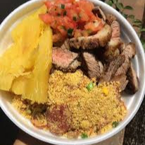 Marmita G Churrasco variado, arroz soltinho, feijão tropeiro no capricho, vinagrete e mandioca