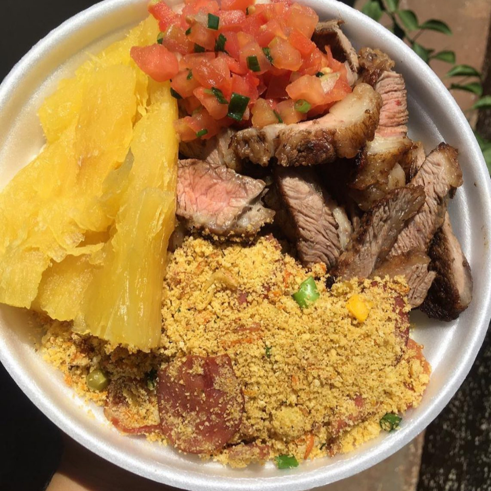 Churrasco variado, arroz soltinho, feijão tropeiro no capricho, vinagrete e mandioca