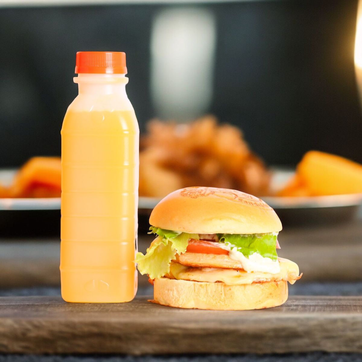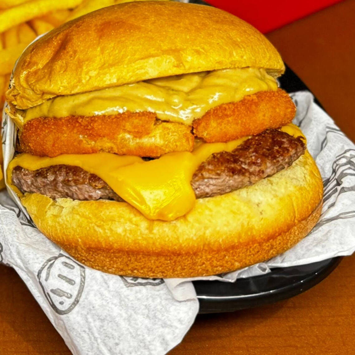 Pão brioche, hambúrguer, queijo cheddar, anel de cebola e molho da casa
