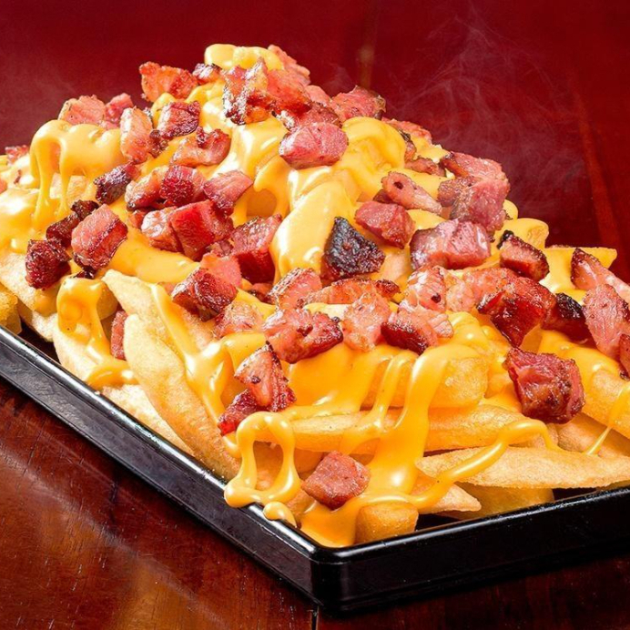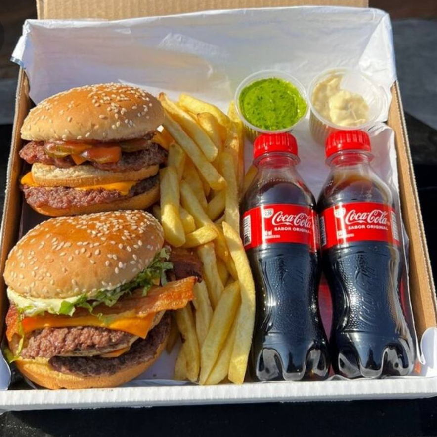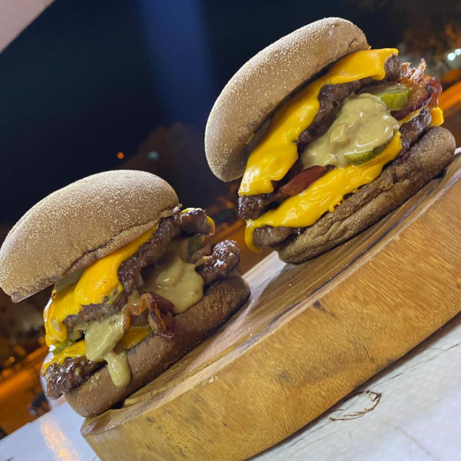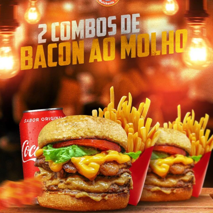 Pão brioche, dois hambúrguer de 60 gramas, cheddar, catupiry e bacon