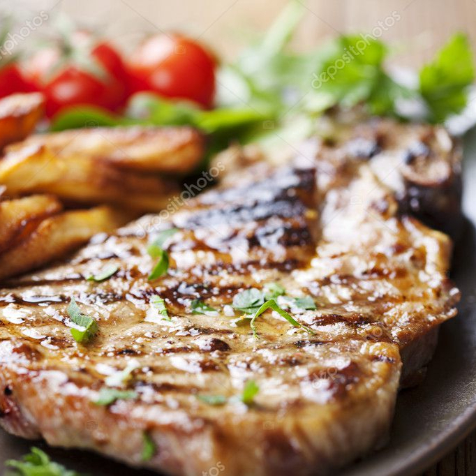 contem na marmita de bisteca suína, arroz branco, feijão de caldo, batata frita, salada e bisteca suína na chapa