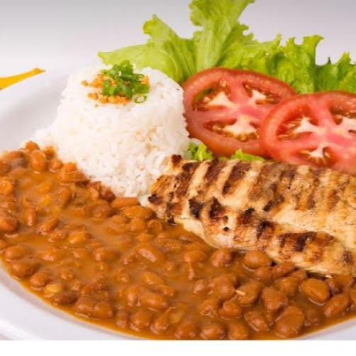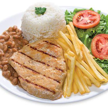 arroz branco, feijão de caldo, batata frita, salada e frango grelhado na chapa