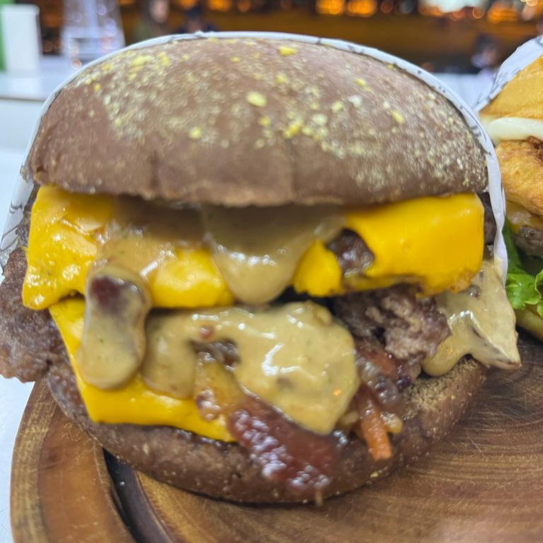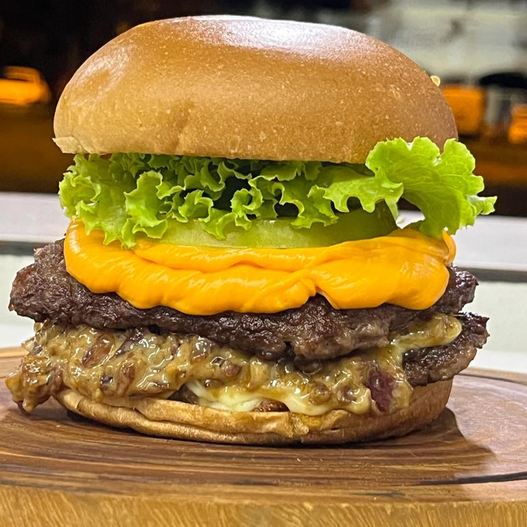 Pão brioche, dois hambúrgueres, cheddar, bacon, picles, e molho da casa