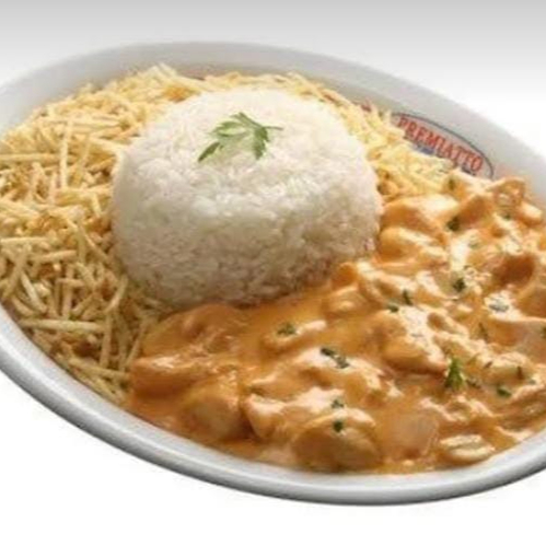 contem na marmita com divisória, arroz branco estrogonofe de frango, e batata frita