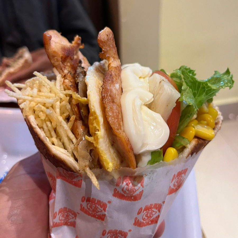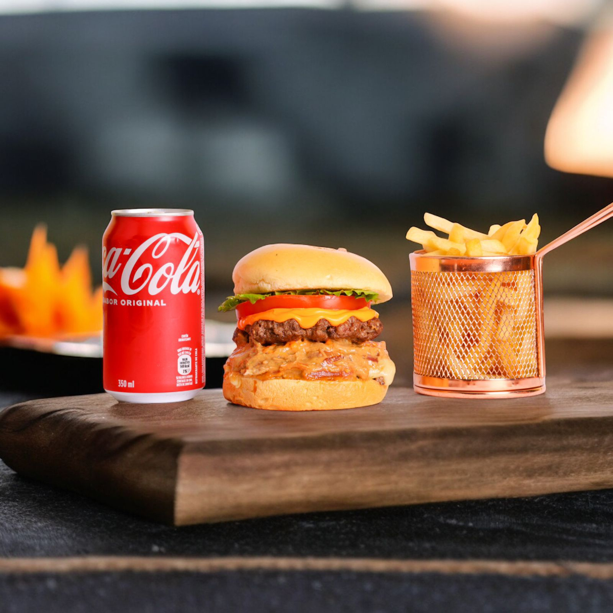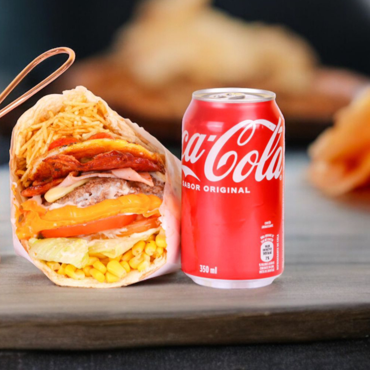 Pão, Hambúrguer, mussarela, presunto, salsicha, bacon, alface, tomate, milho e batata palha, coca lata