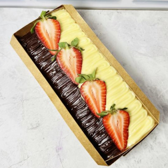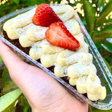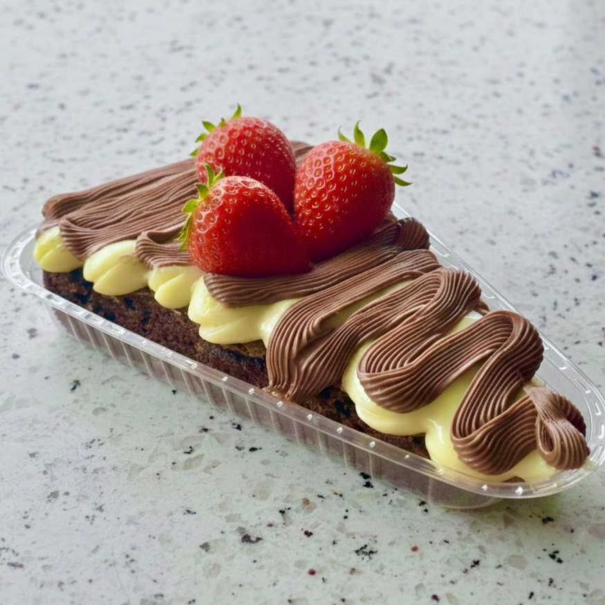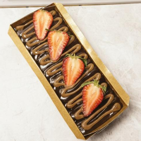 fatia de Brownie Deliciosa com cobertura de Leite Ninho, Nutella e Morango Fresco Aprox. 185g