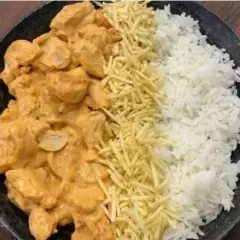 Deliciosa strogonoff de frango feita na hora. Acompanha, arroz batata palha salada.