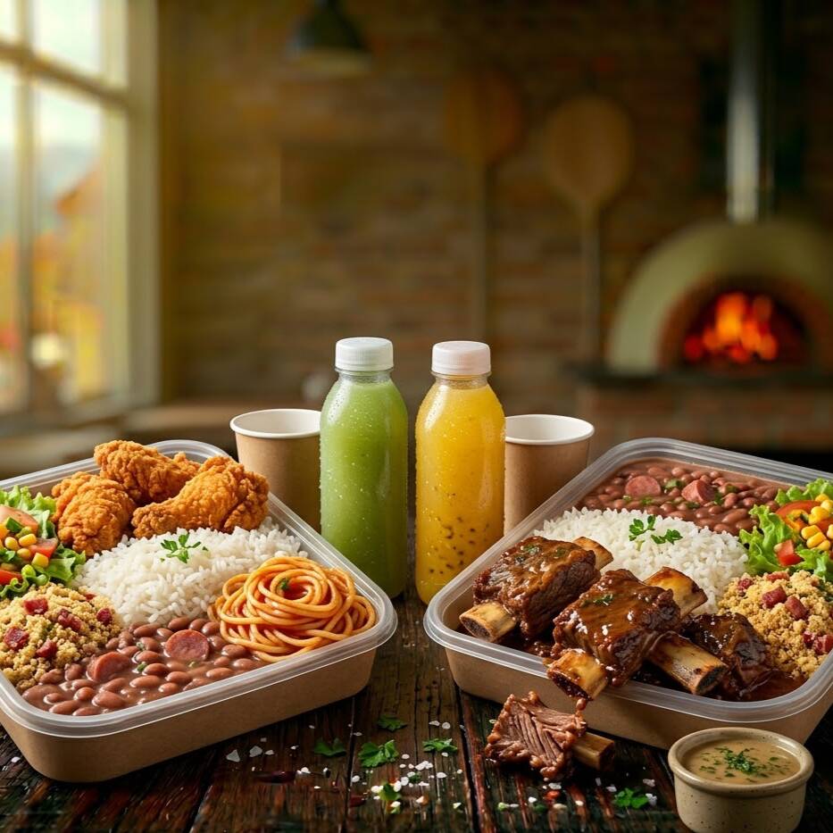 2 marmitas! Ambas acompanham arroz, feijão de caldo, macarrão, farofa, salada