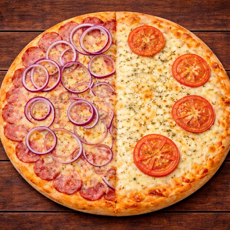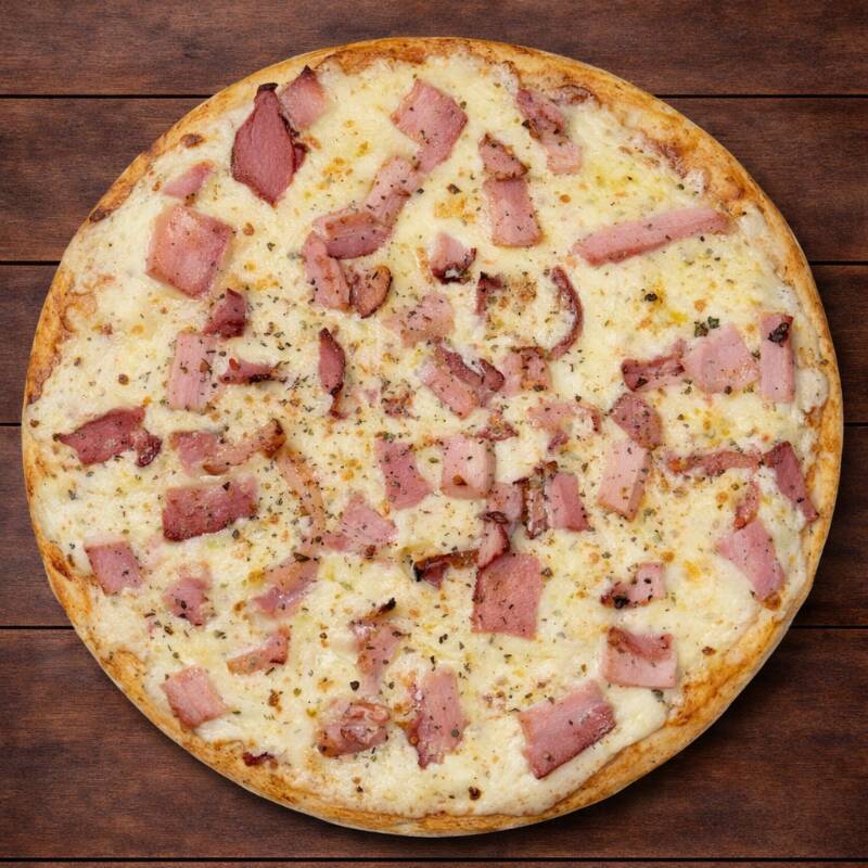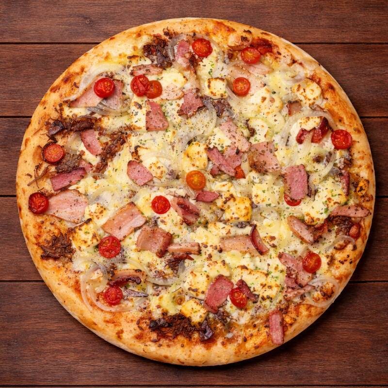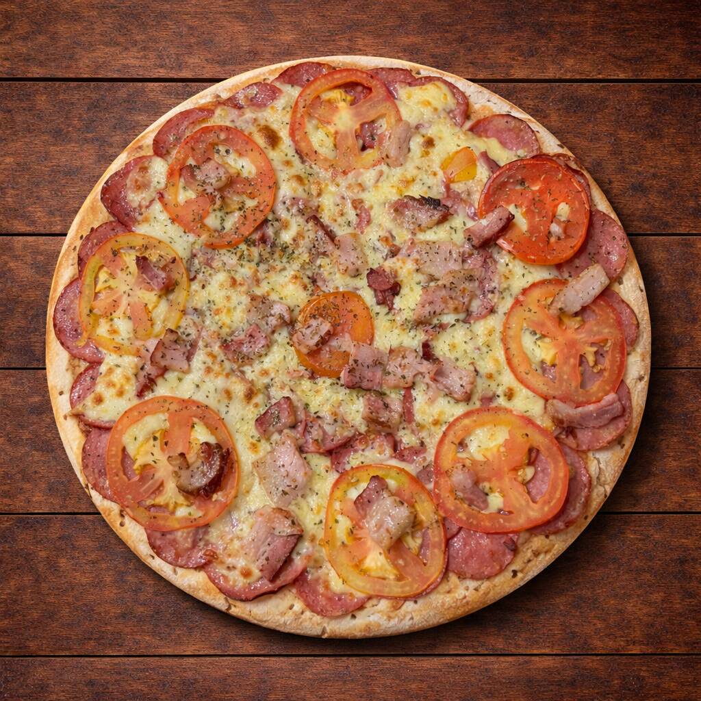 Molho, mussarela, calabresa,tomate, bacon, azeitona e oregano.