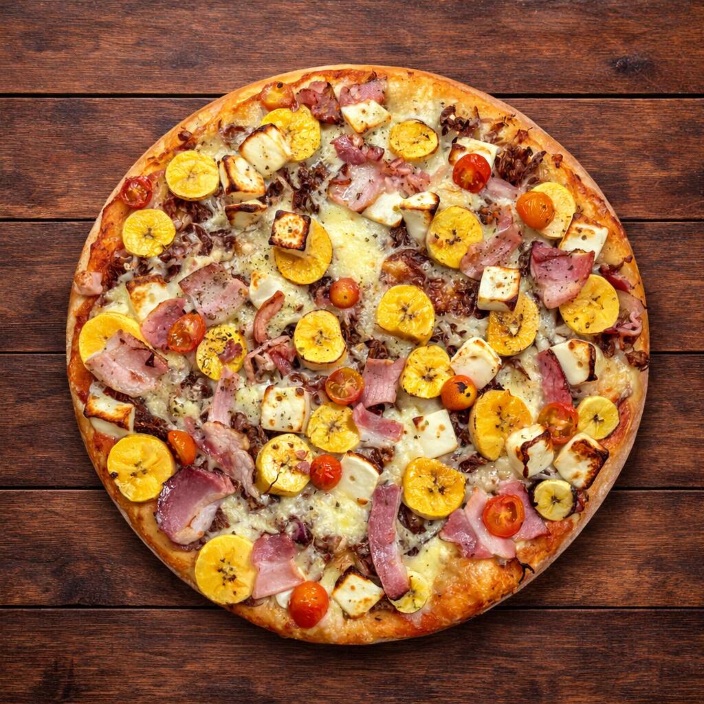 molho, mussarela, carne de sol, bacon, banana, e orégano .