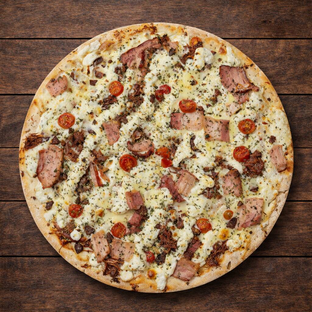 Molho de tomate , mussarela carne de sol , cream cheese, bacon e orégano.