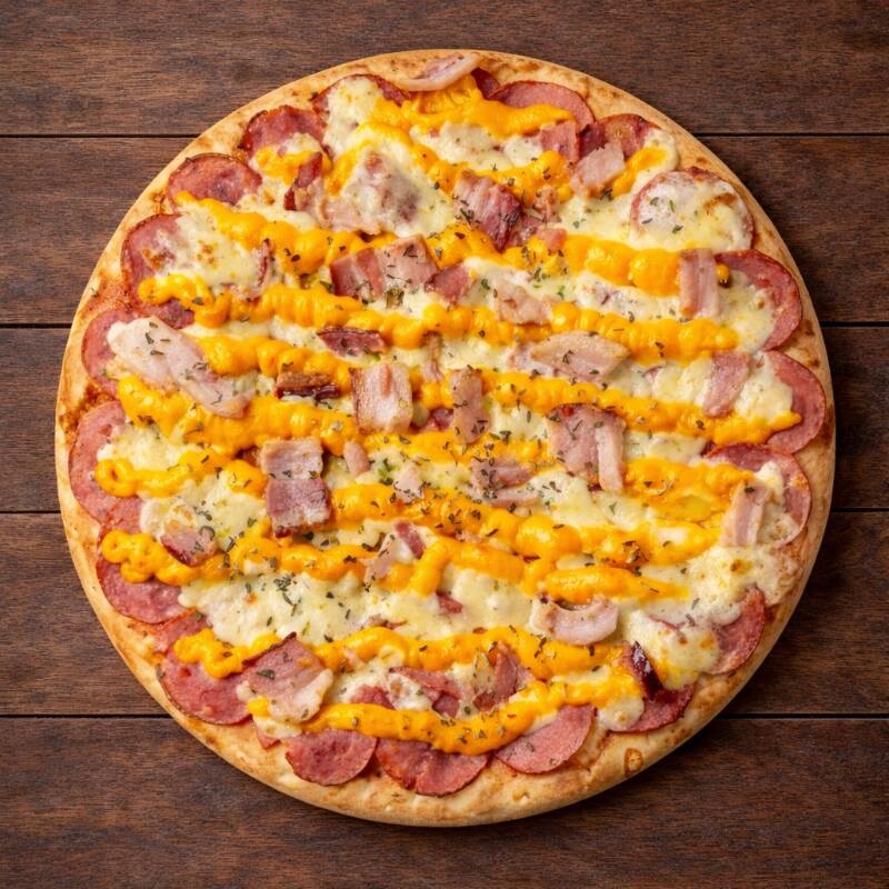 Molho, mussarela , calabresa, cheddar , bacon e orégano