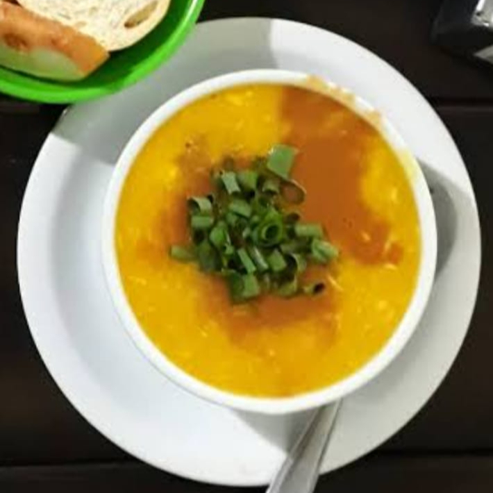 delicioso caldo misto, frango e feijao 400 ml ja acompanha torrada, torresmo e cebolinha
