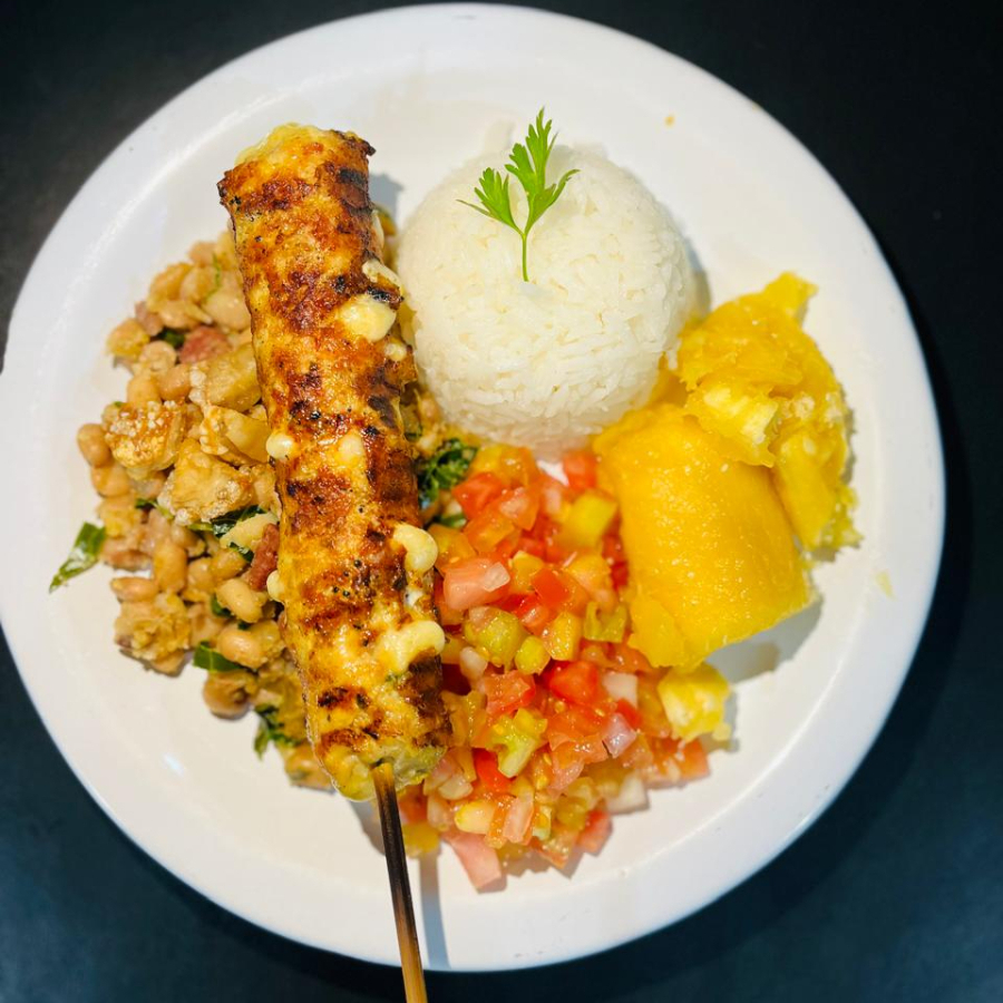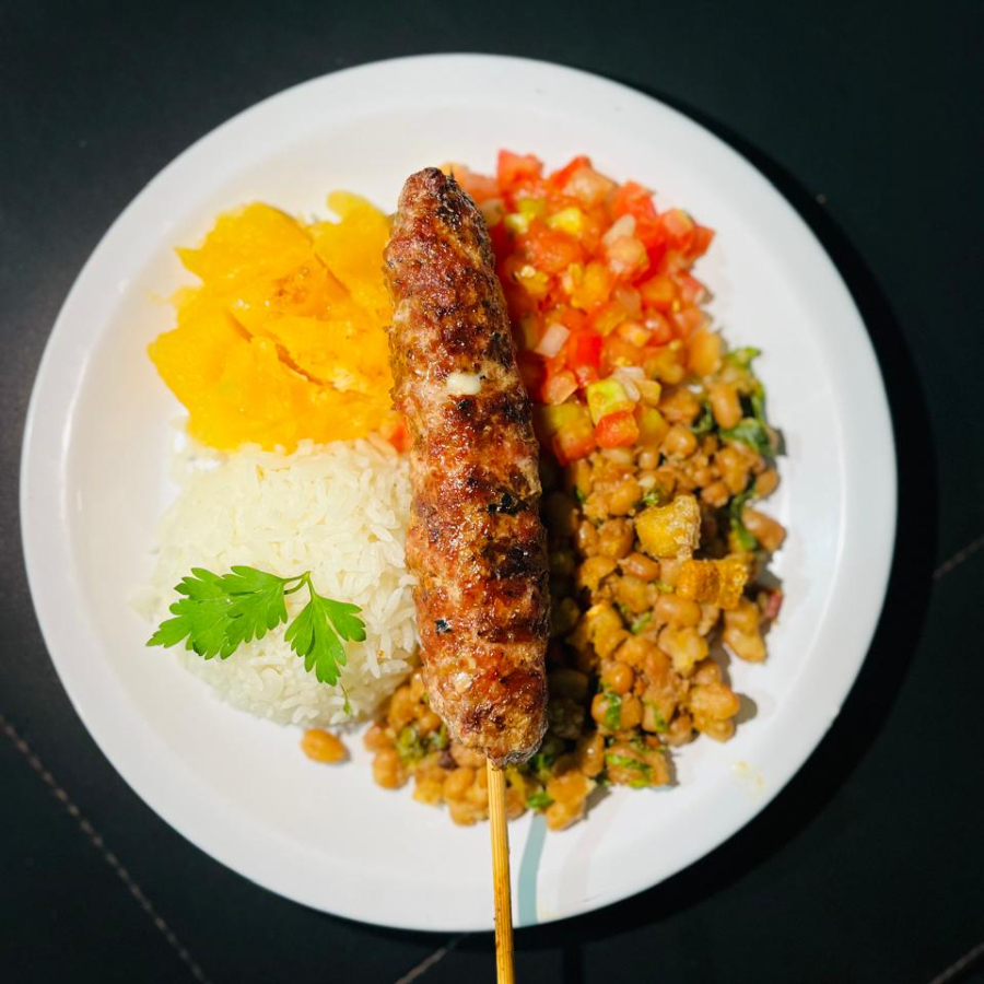 DELICIOSA JANTINHA DE KAFTA BOVINA COM MUSSASRELA, JÁ ACOMPANHA MANDIOCA COZIDA, VINAGRETE, ARROZ BRANCO E FEIJÃO TROPEIRO