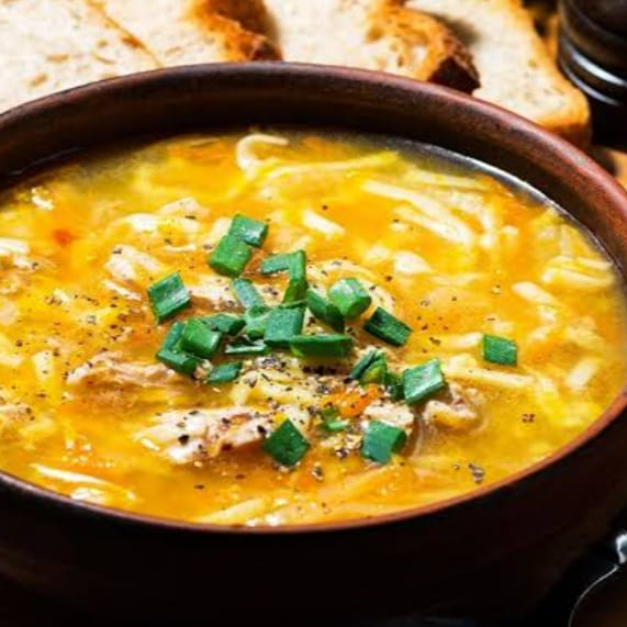 delicioso caldo de frango 400 ml ja acompanha torrada, torresmo e cebolinha