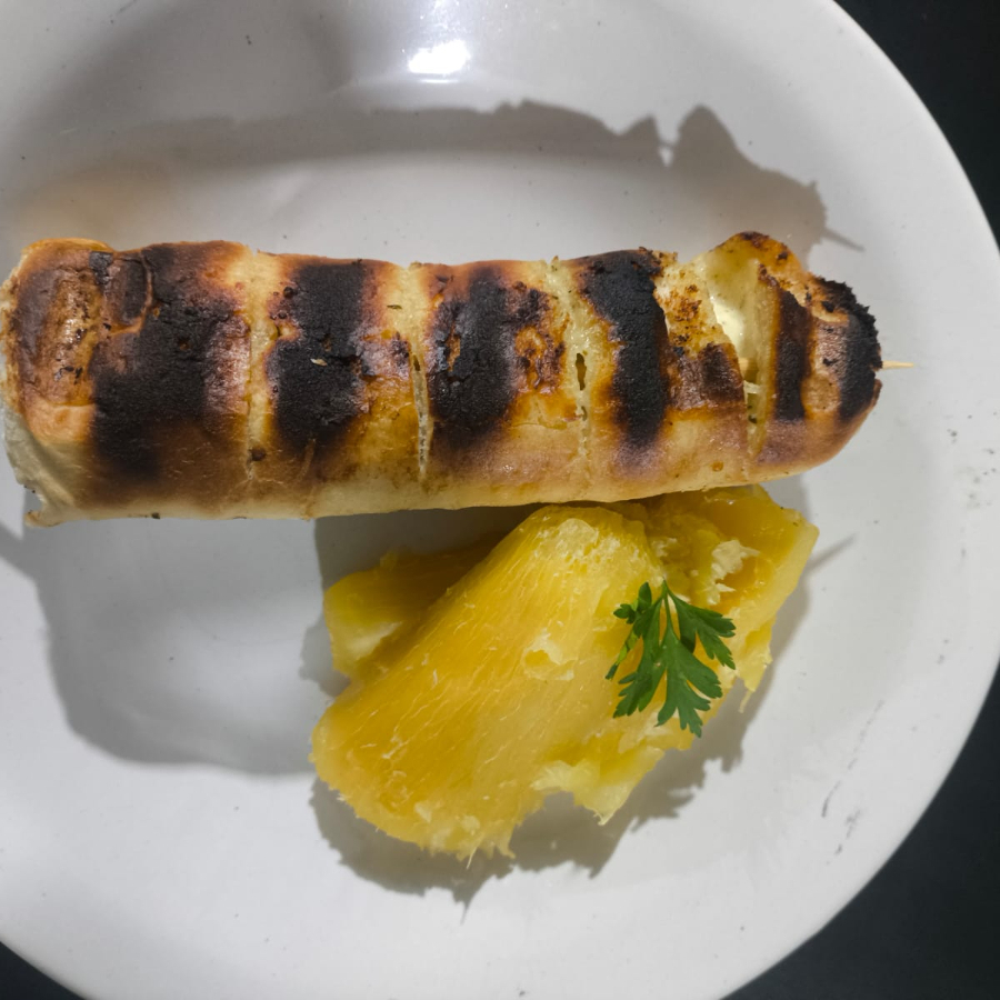 DELICIOSA JANTINHA DE PÃO DE ALHO JÁ ACOMPANHA MANDIOCA COZIDA, VINAGRETE, ARROZ BRANCO E FEIJÃO TROPEIRO
