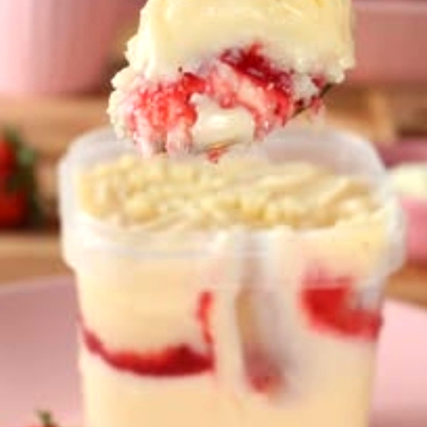 Irresistível bolo no pote com geleia de frutas Vermelhas, creme de ninho e bolo de baunilha molhadinho uma explosão de sabores, peça já o seu