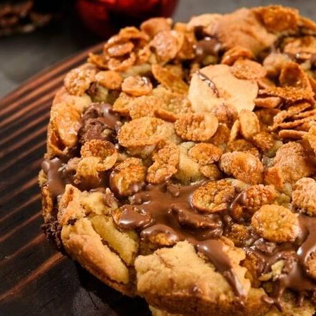 Torta de 1kg de massa branca com pedaços de chocolate ao leite, marshmallows e coberta com sucrilhos caramelizados. Perfeita para comer com aquele sorvete. Levamos cerca de 40 min pra finalizar ela e te enviar.
