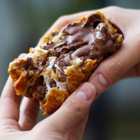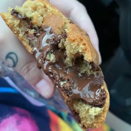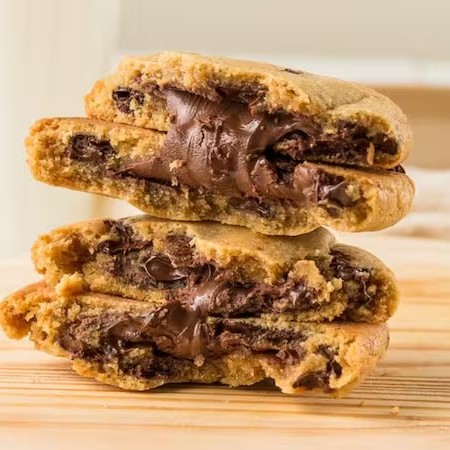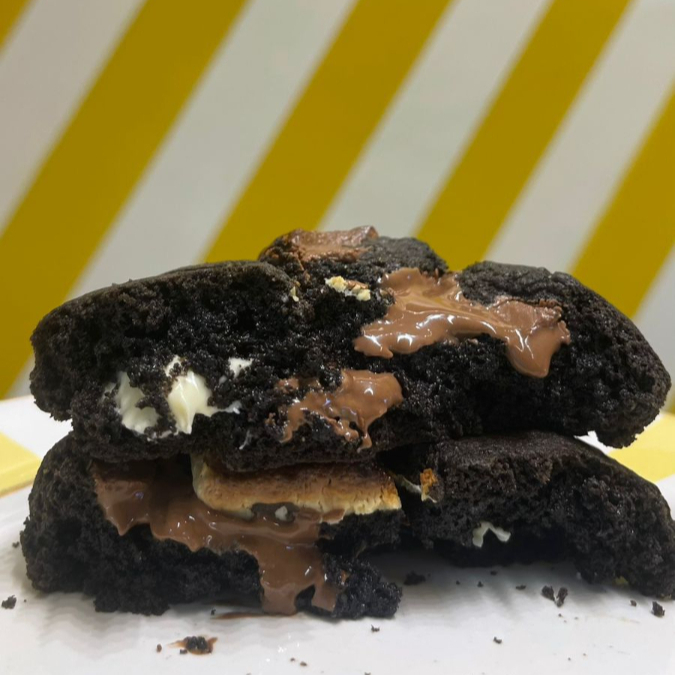 Cookie de 170g de massa branca, chocolate meio amargo e recheado com Nutella.