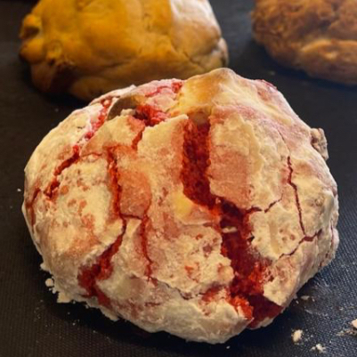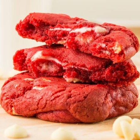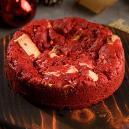 Cookiezão de 170g de massa vermelha com chocolate branco e pedaços de cream cheese.