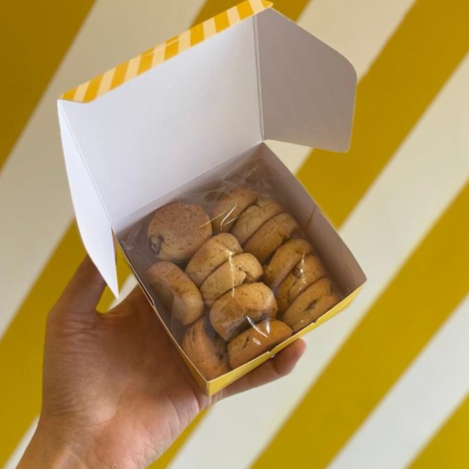 Caixinha com 150g de mini cookies nos sabores que você preferir. Os cookies possuem cerca de 10g cada.