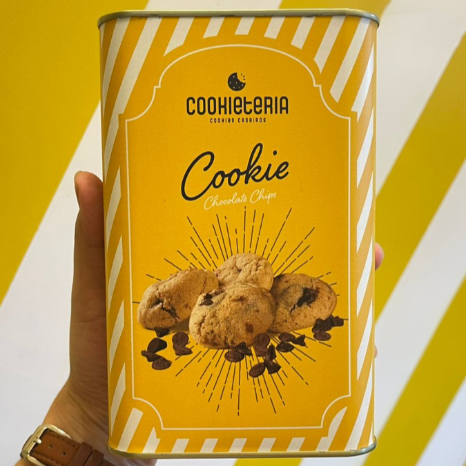 Lata com 33 mini cookies de 10g cada no sabor chocolate chips.