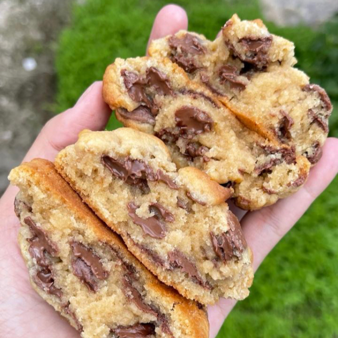 Cookie de massa branca com pedaços enooormes de chocolate ao leite. O cookie mais tradicional, simples, mas muito bem feito.