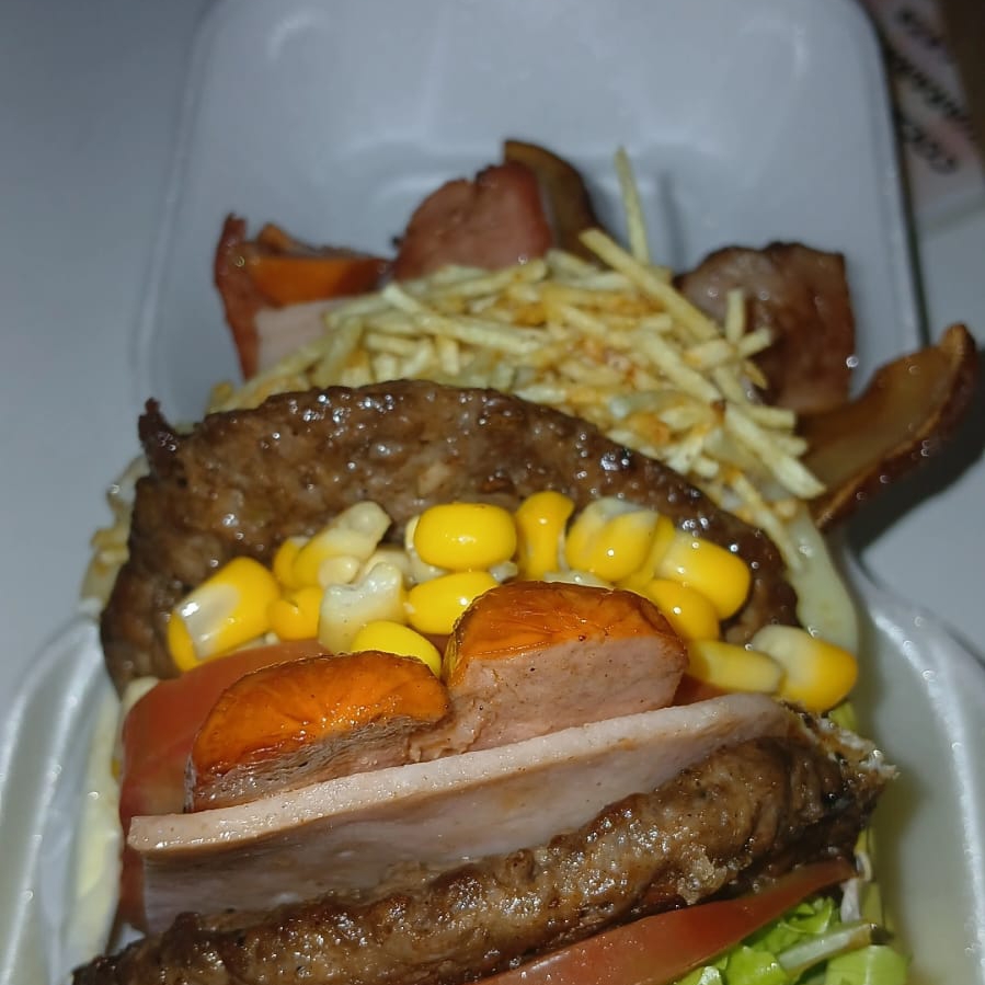 Pão, carne, bacon,presunto, mussarela, salada, milho e batata