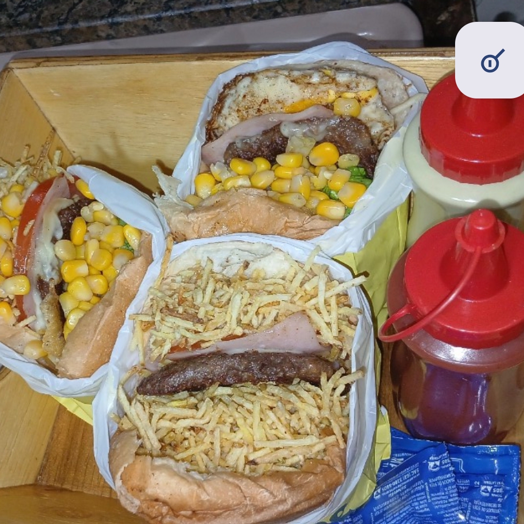 Pão, carne, ovo, bacon, salsicha, presunto, mussarela ,salada, milho e batata