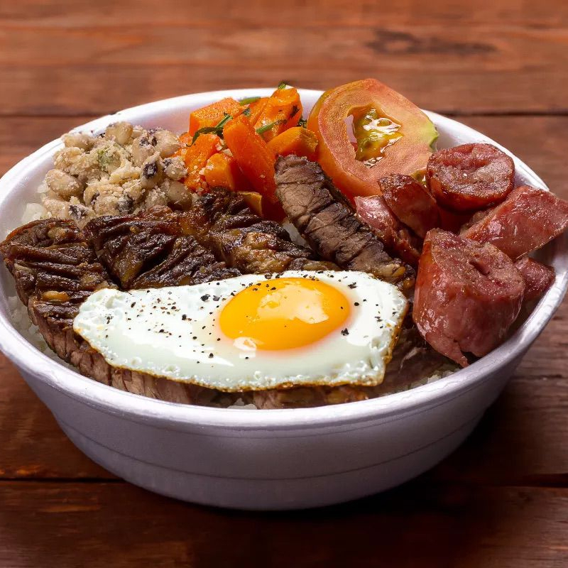 Arroz Branco, Feijão de Caldo, Macarrão, Farofinha Caseira, Lombo suíno Acebolado, 1 fritura, Verdura e salada do Dia