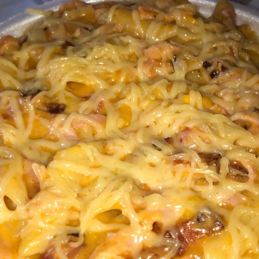 CARNE DESFIADA, BACON, AZEITONA, MILHO, MANJERICÃO, BRÓCOL, MUNJERICÃO, MUSSARELA, ORÉGANO, REQUEIJAO E UVAS PASSAS