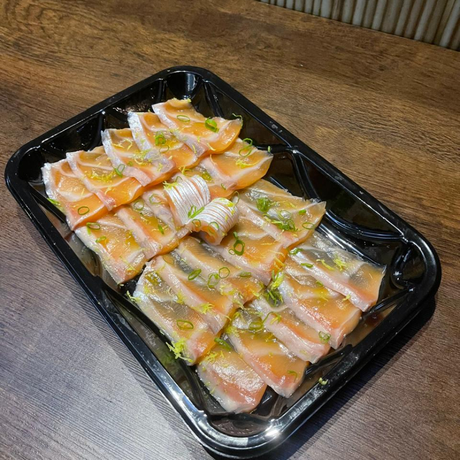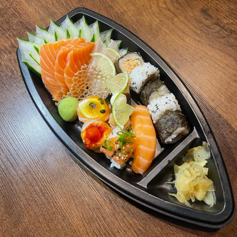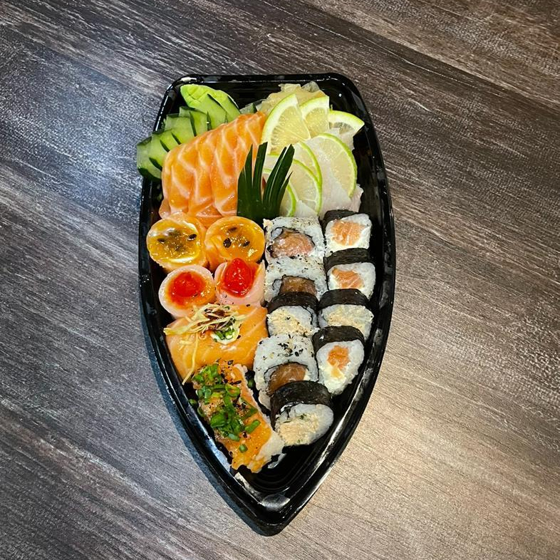 10 SASHIMI DE SALMAO, 6 NIGURI DE SALMAO, 3 GUNKAN DE SALMAO COM MARACUJA, 3 GUNKAN SHAKE, 5 URAMAKI FILADELFIA E 5 HOSSOMAKI FILADELFIA. ACOMPANHA 2 HASHI, 4 SHOYO E 2 TARE