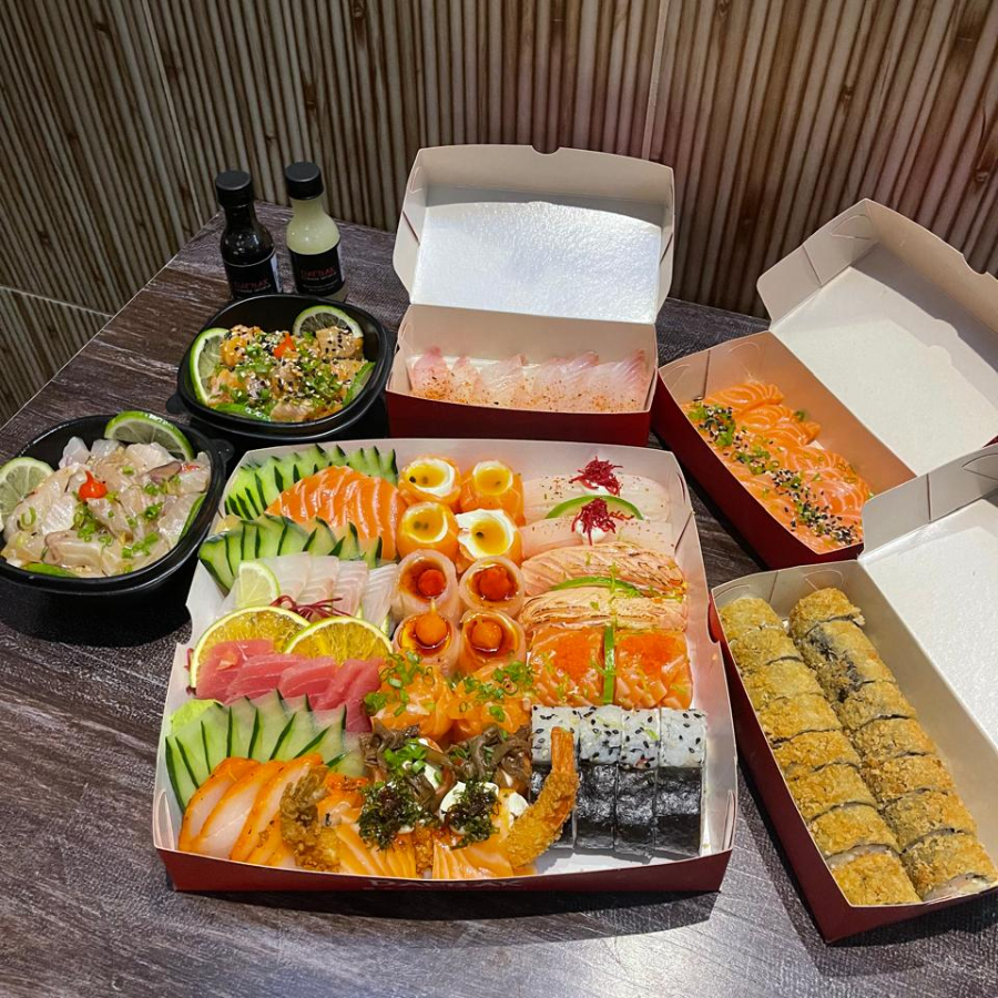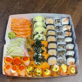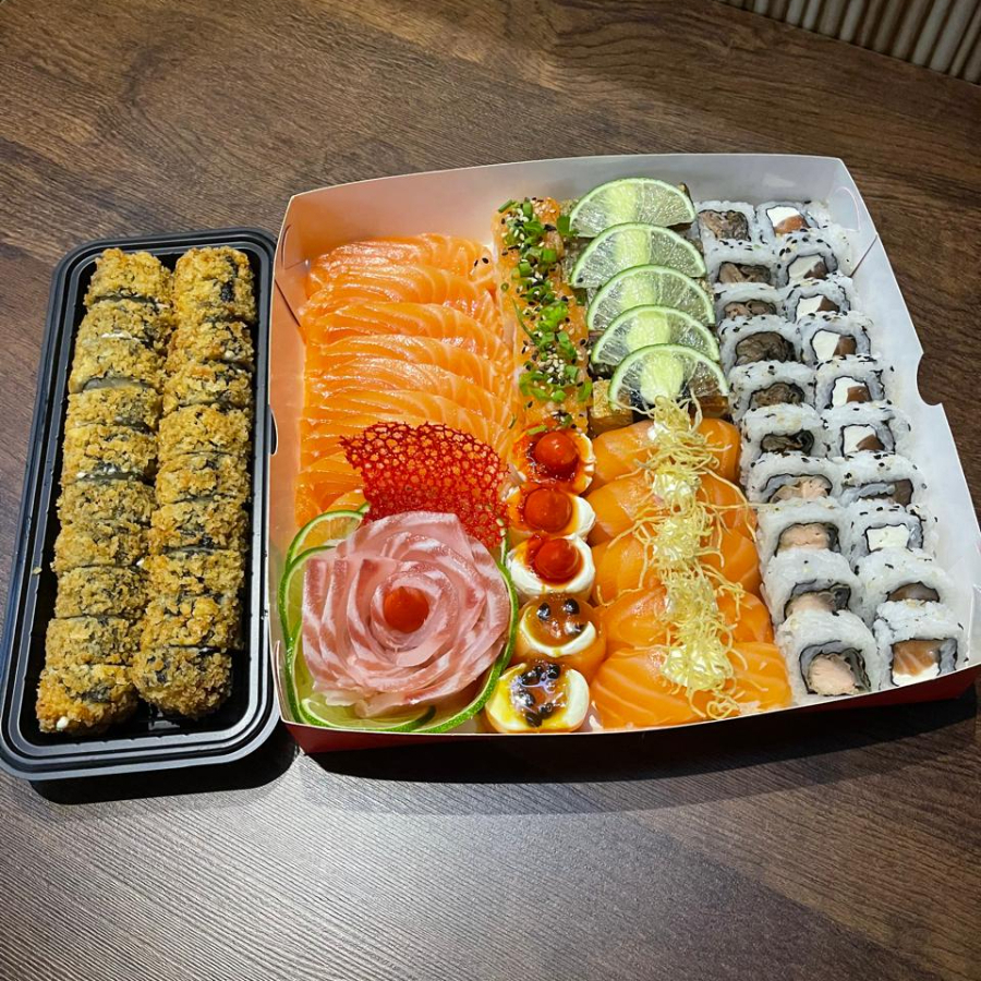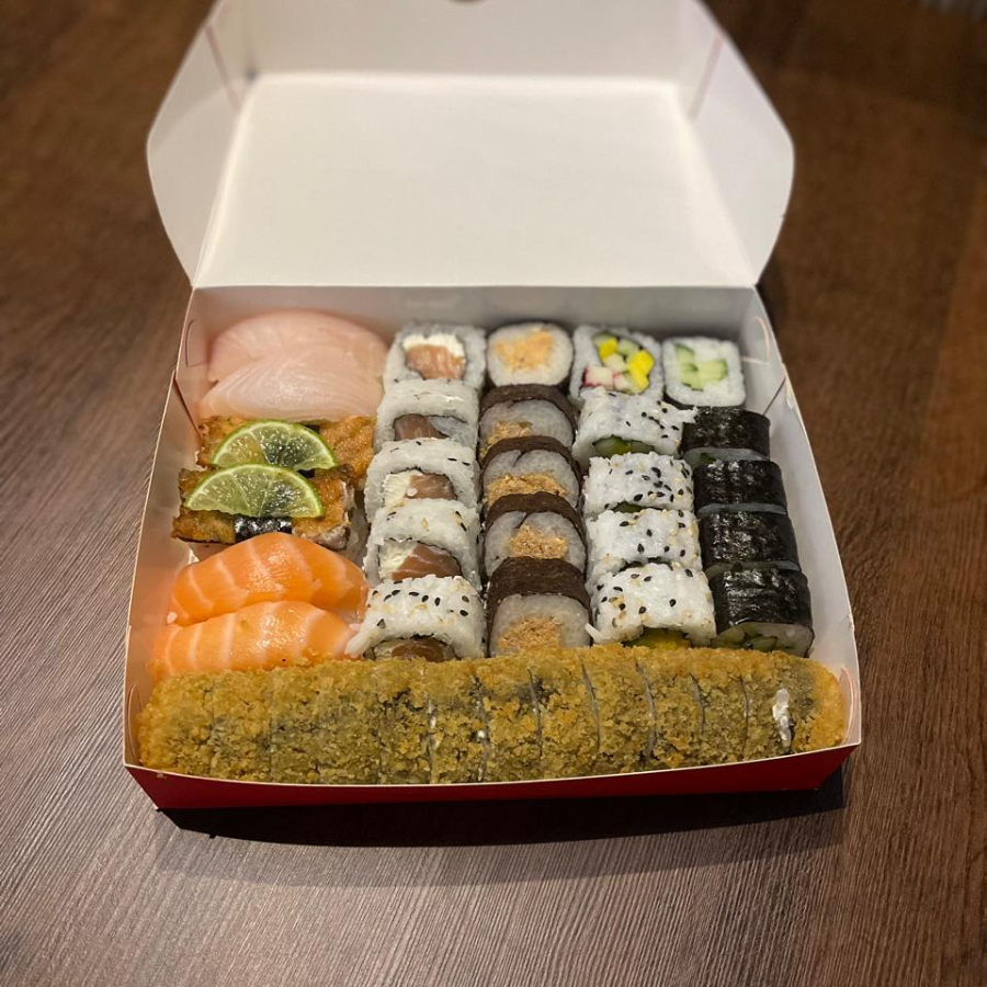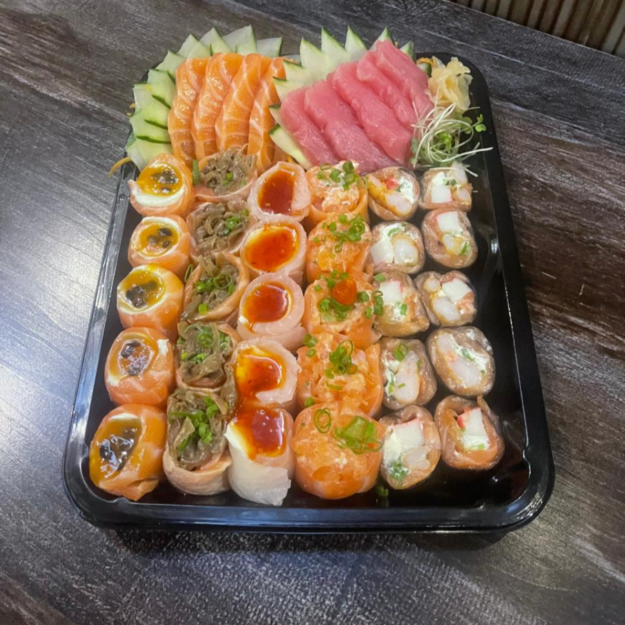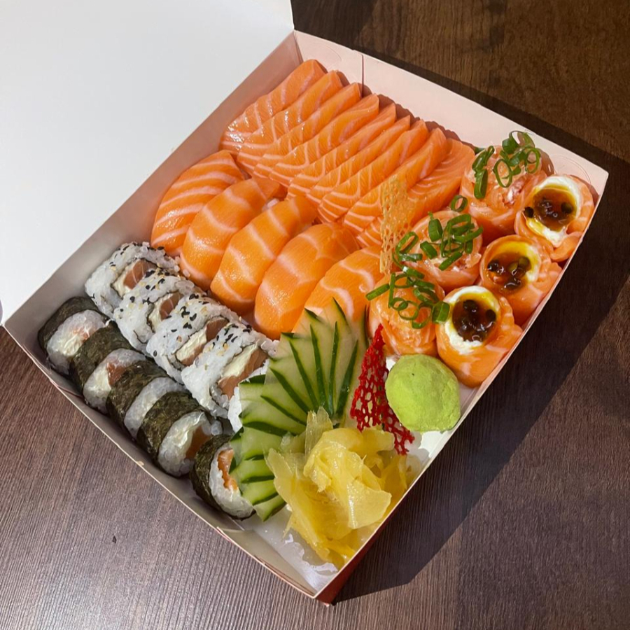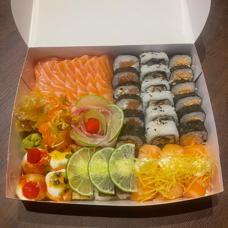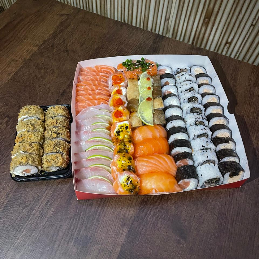 10 Sashimi de salmao, 10 Sashimi de tilapia, 10 Uramaki filadelfia, 10 Uramaki skin, 5 Niguiri de salmao, 5 Niguiri Skin, 5 Batera, 3 Gunkan de tilapia com calda de pimenta, 2 Gunkan de salmao com calda de maracuja e 20 hot filadelfia