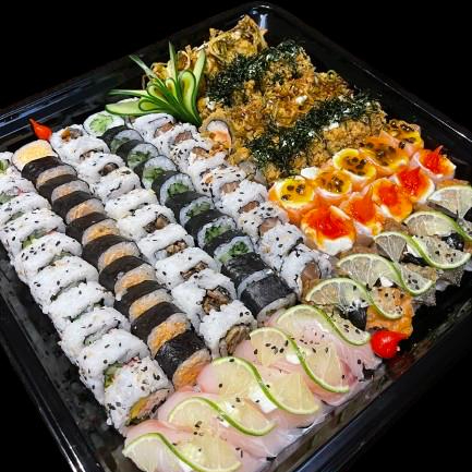 4 Sashimi de salmao, 4 Sashimi de tilapia, 4 Sashimi de atum, 4 Sashimi de prego, 2 Gunkan shake, 2 Gunkan de shimeji, 2 Gunkan ebifurai, 4 Gunkan de salmao c/ calda de maracuja, 4Gunkan de tilapia c/ calda de pimenta, 2Niguiri de salmao, 2Niguiri de tilapia, 2Barriga de salmao trufado, 4Uramaki filadelfia, 4Hossomaki filadelfia, 1ceviche , 1tataki , 1 Carpaccio de salmao, 1 de tilapia e 18 hot