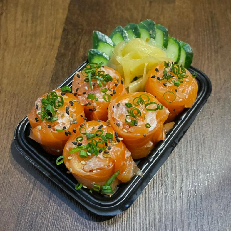 Salmao, cream cheese e calda de maracuja. 5 unidades