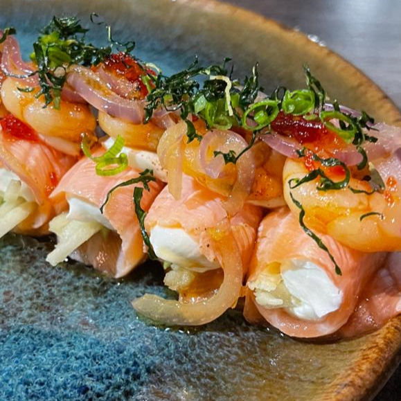 SALMAO, CREAM CHEESE, MAÇA VERDE E CAMARAO. 5 UNIDADES