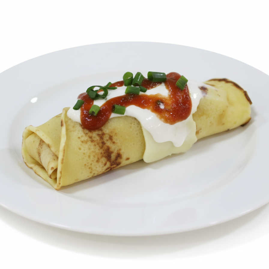 Panqueca de Carne, com molho de tomate, queijo e cebolinha por cima